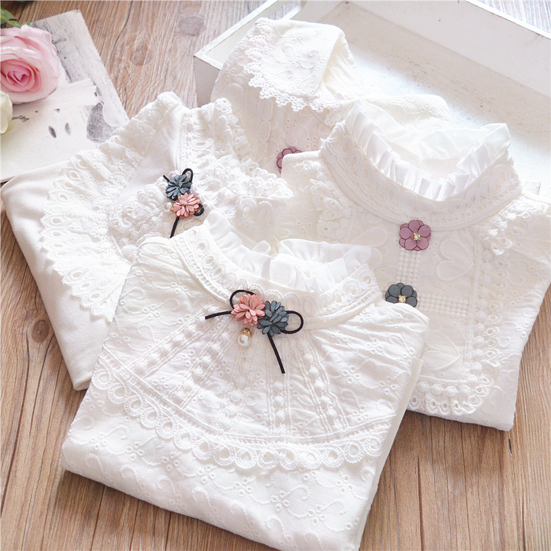 纯棉女童白色打底衫 儿童弹力翻领珍珠衬衫 女孩立领蕾花边中大童