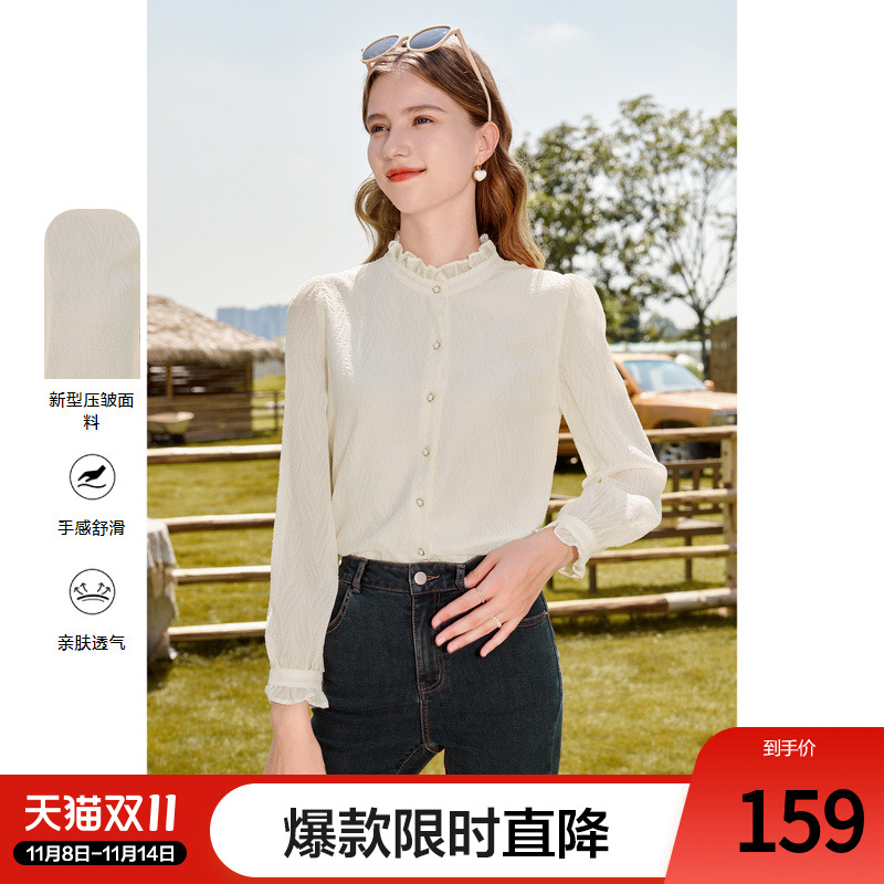 设计师款佐丹奴女装新款纯棉宽松立领法式花边衬衫女长袖18345915