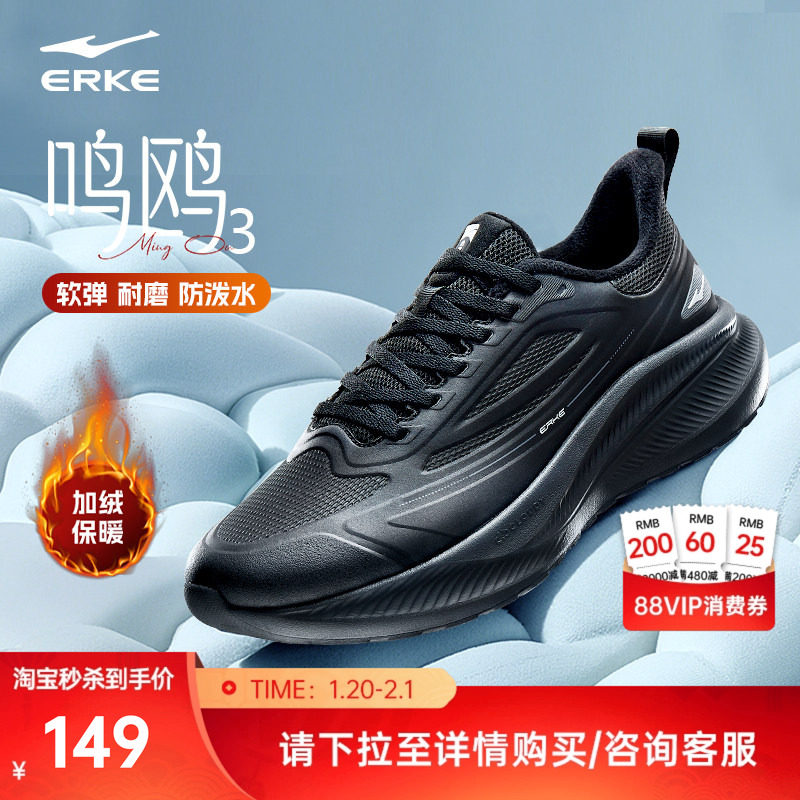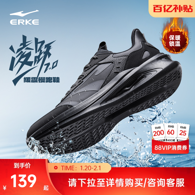 鸿星尔克减震跑步鞋冬季加绒男鞋软底防水运动鞋新款黑色轻便跑鞋