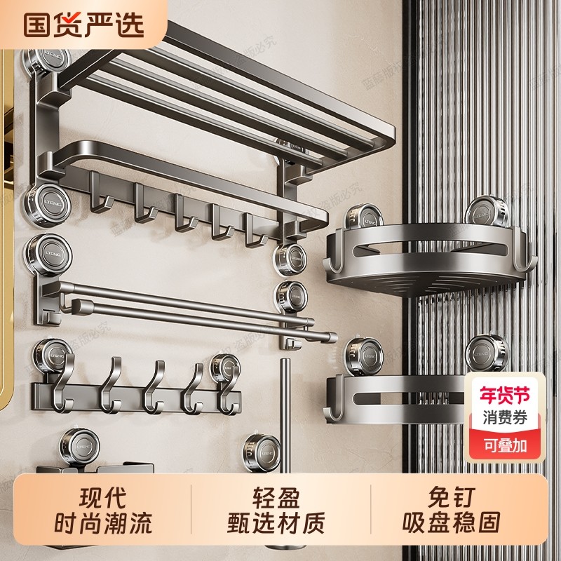 吸盘毛巾架卫生间免打孔浴巾置物架子一体浴室厕所挂杆太空铝套件