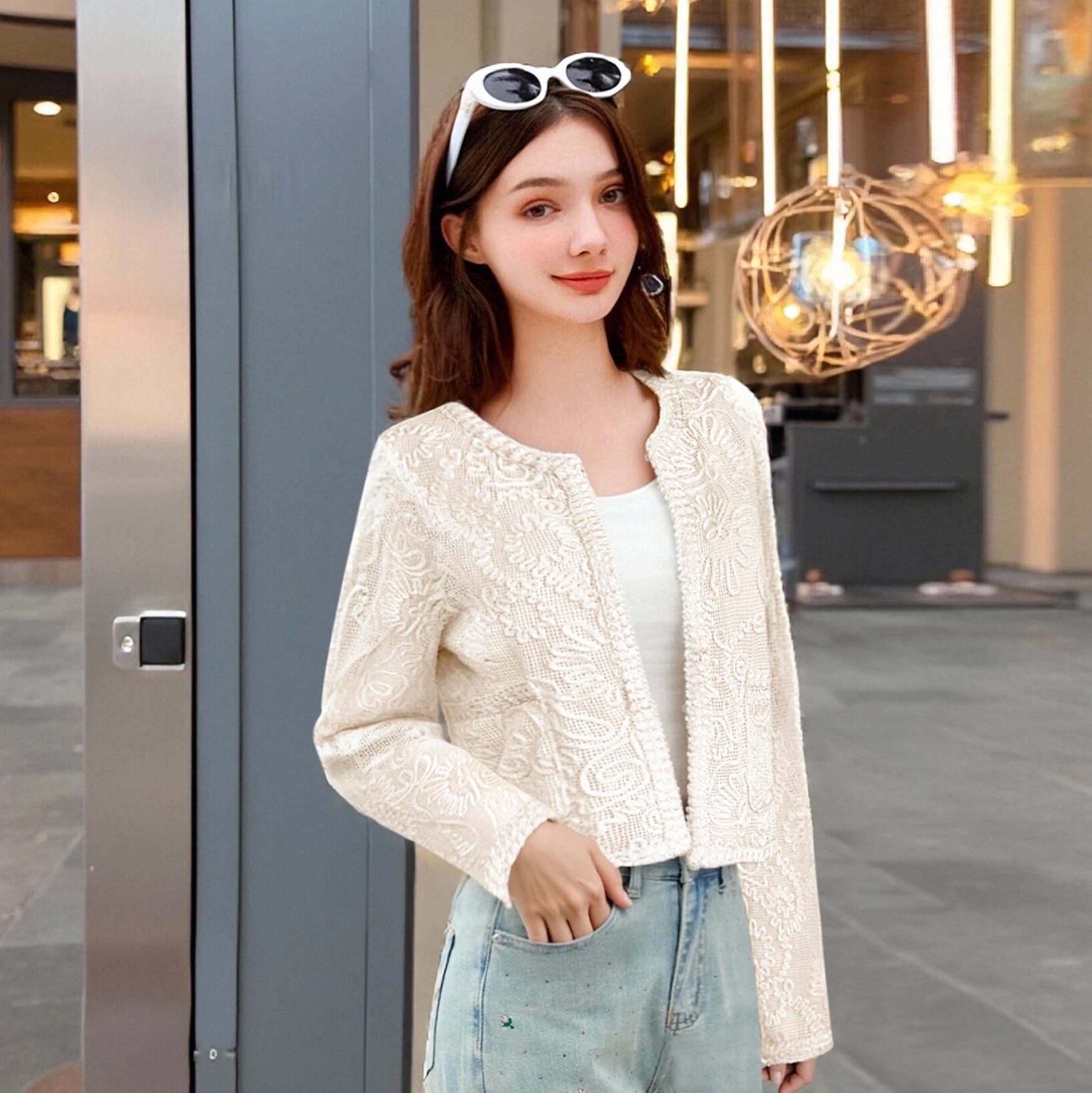 zk lin韩系温柔蕾丝提花短开衫女软糯针织外套气质优雅浪漫设计感