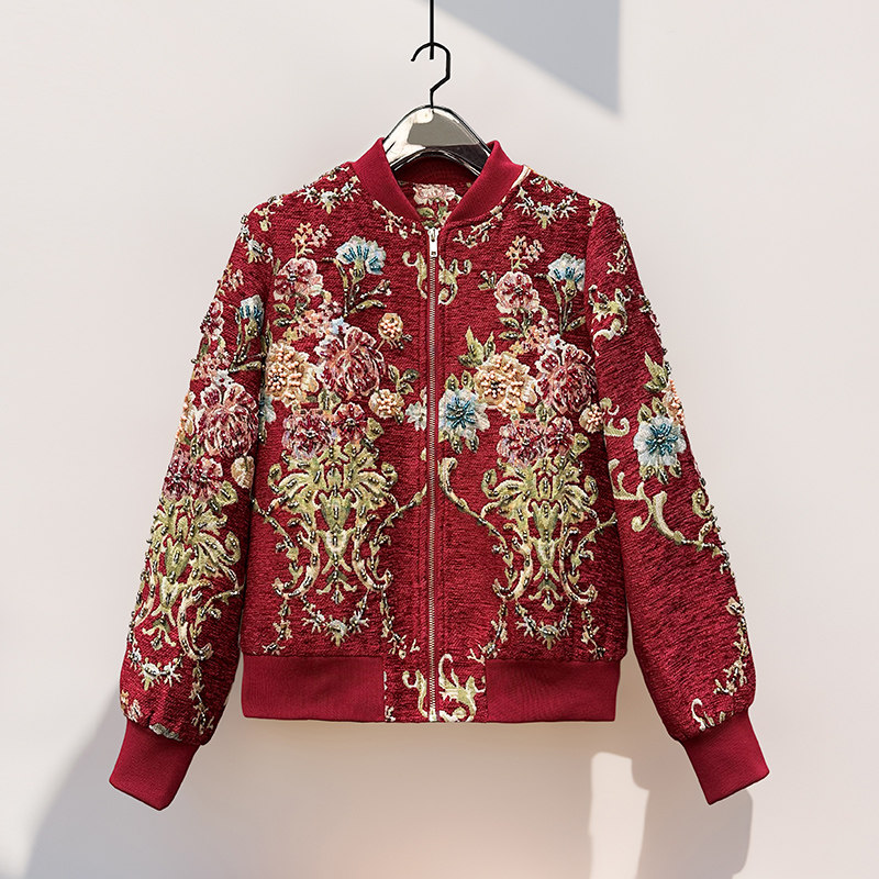 秋季新款女装雪尼尔重工钉珠刺绣花瓶棒球服长袖酒红色轻奢短外套