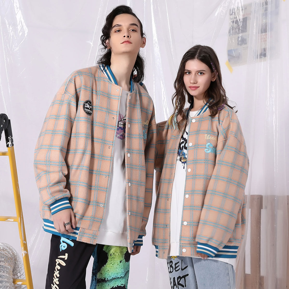 XXGOGO春秋季格纹格子字母绣花长袖棒球服宽松夹克外套男女同款
