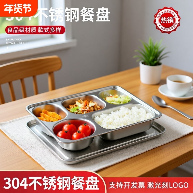 304不锈钢快餐盘加厚分格餐盘商用儿童幼儿园学生成人食堂快餐具