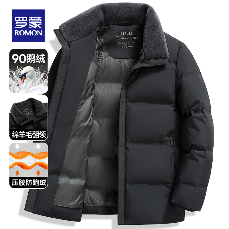罗蒙鹅绒羽绒服男冬季新款中老年商务休闲绵羊毛翻领短款冬装外套