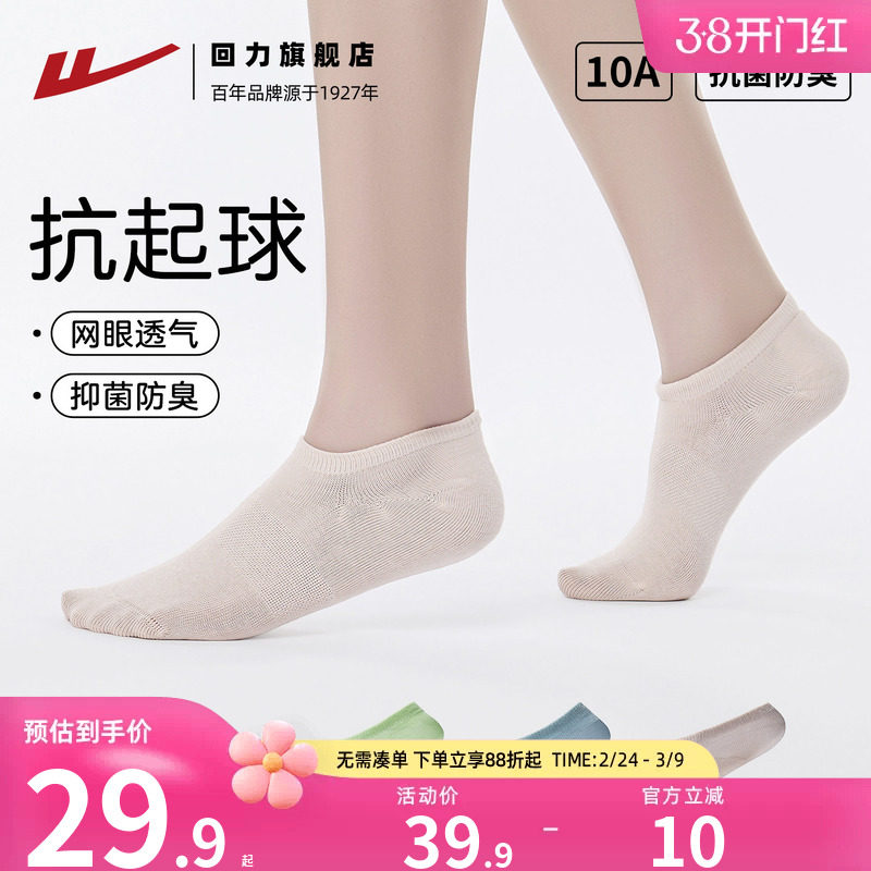 【10A抗菌】回力袜子女隐形船袜棉袜防滑不掉跟防臭纯色袜夏薄款