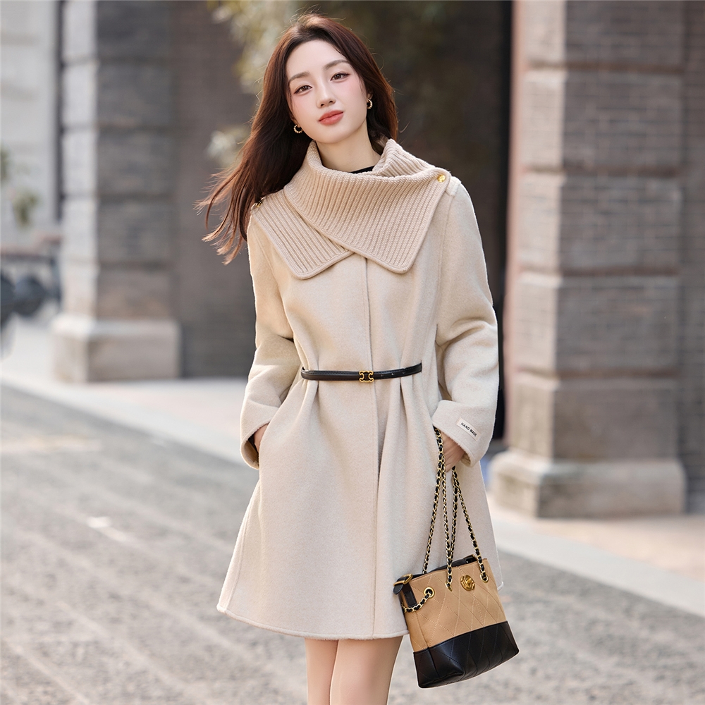 2025秋冬斗篷新款立领双面羊毛大衣系带假两件针织袖羊毛呢外套女