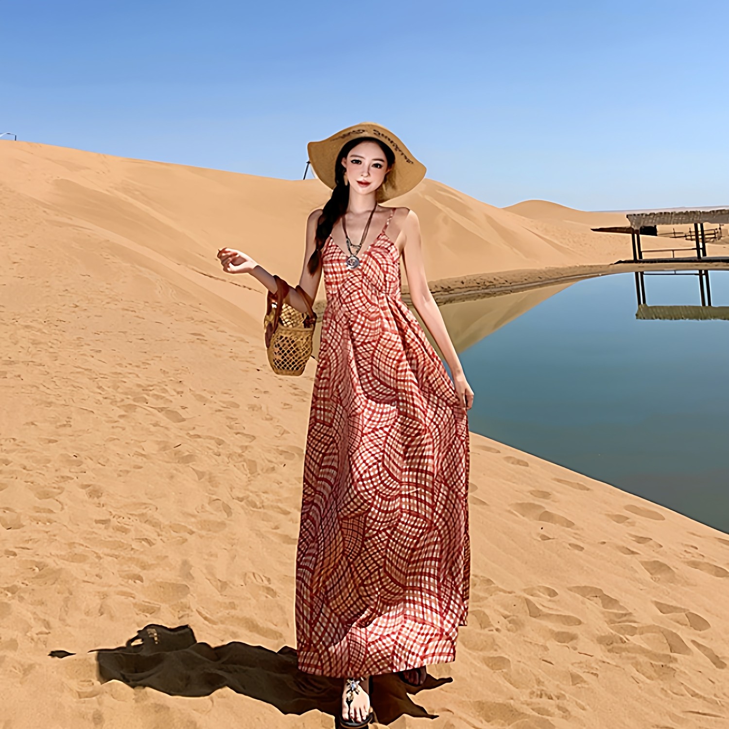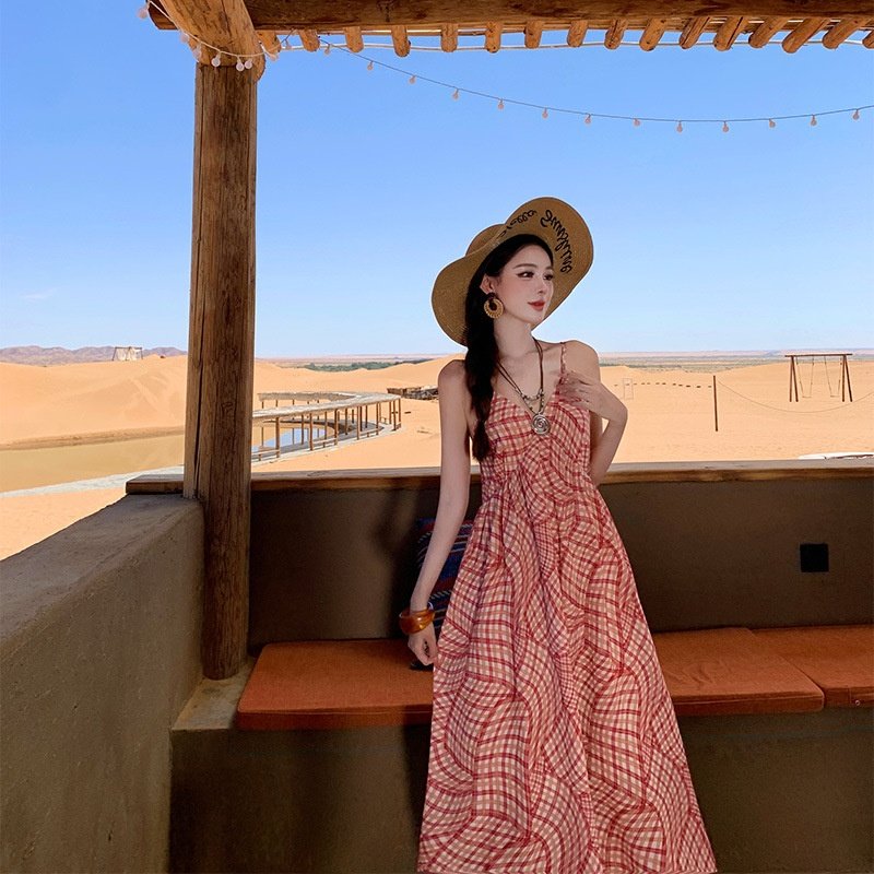 法式度假风吊带连衣裙泰国多巴胺海边沙滩裙云南气质格纹显瘦长裙