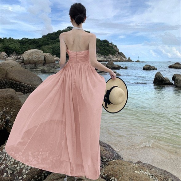 泰国旅行拍照沙滩裙女夏气质露背挂脖吊带连衣裙海边度假仙女长裙