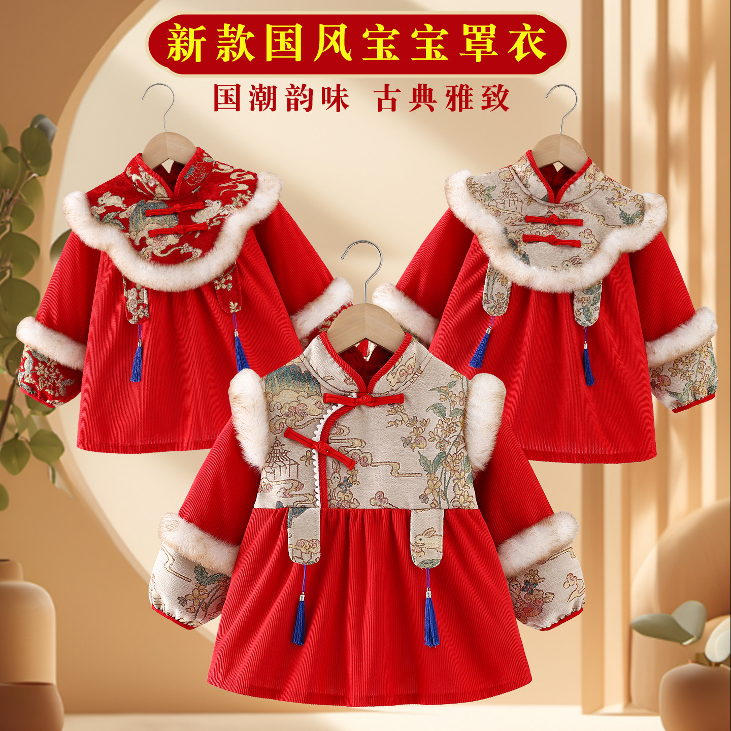 宝宝新年罩衣儿童外穿围兜围裙防水防脏中国风喜庆大红色拜年衣服