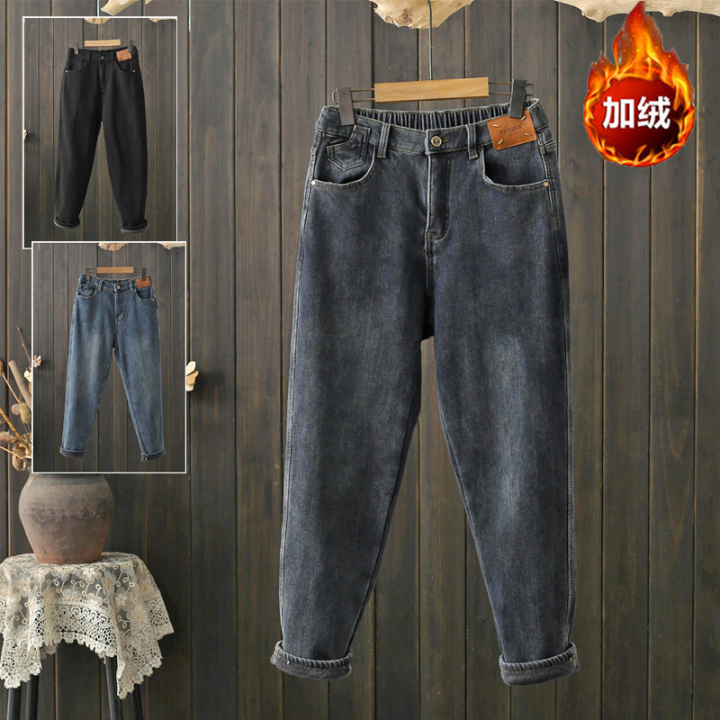 秋冬大码200斤黑色加绒牛仔裤高腰显瘦宽松弹力哈伦老爹萝卜裤子
