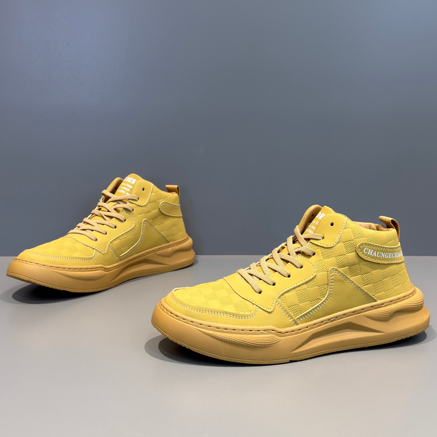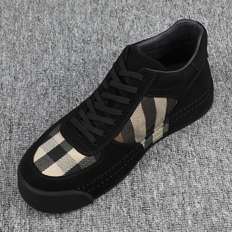 欧洲站高帮男鞋2025新款时尚真皮拼接格子布男士系带厚底休闲板鞋