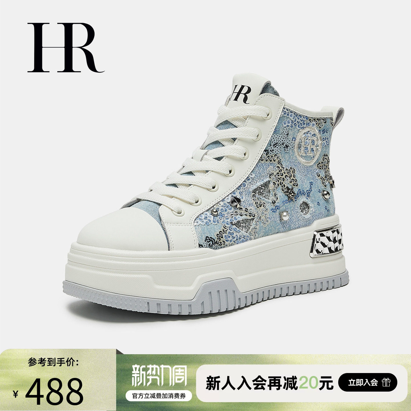 HR赫莲娜板鞋2026春季新款高帮鞋厚底小众牛仔帆布拉链休闲女鞋子