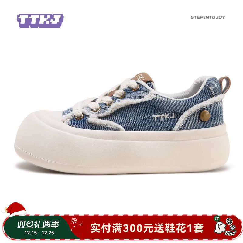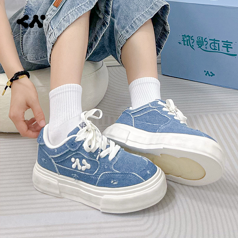 TTKJ牛仔帆布鞋女2025超火鞋子小狗鞋花休闲运动大头厚底蓝色板鞋