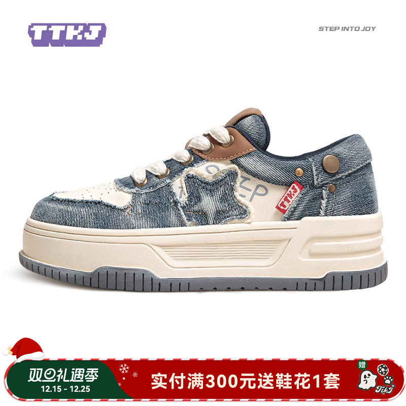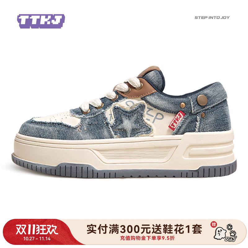 TTKJ鞋子女款牛仔布蓝色帆布鞋秋冬休闲女鞋星星厚底增高运动板鞋