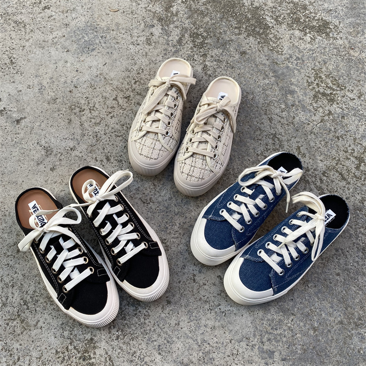 西班牙欧美休闲百搭帆布鞋包头半拖鞋牛仔布无脚后跟懒人凉拖鞋女