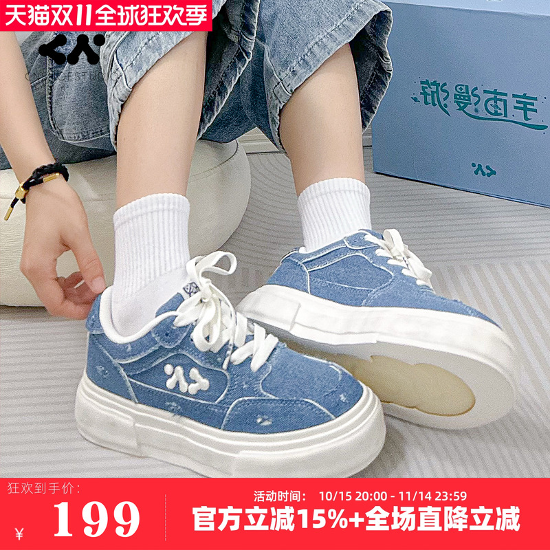 奇安达牛仔布帆布鞋女新款秋季透气情侣小众原创学生休闲厚底板鞋