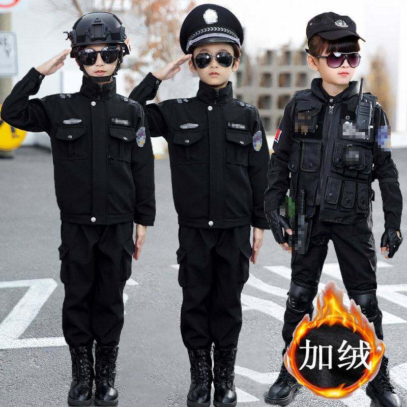 儿童警官衣服冬季加绒加厚棉服军装套装男女童特警衣服警察演出服