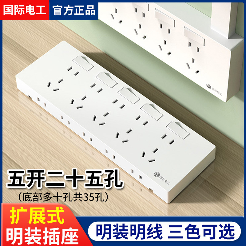 国际电工明装5五孔插座明线明盒墙面墙壁多孔家用超薄带开关面板