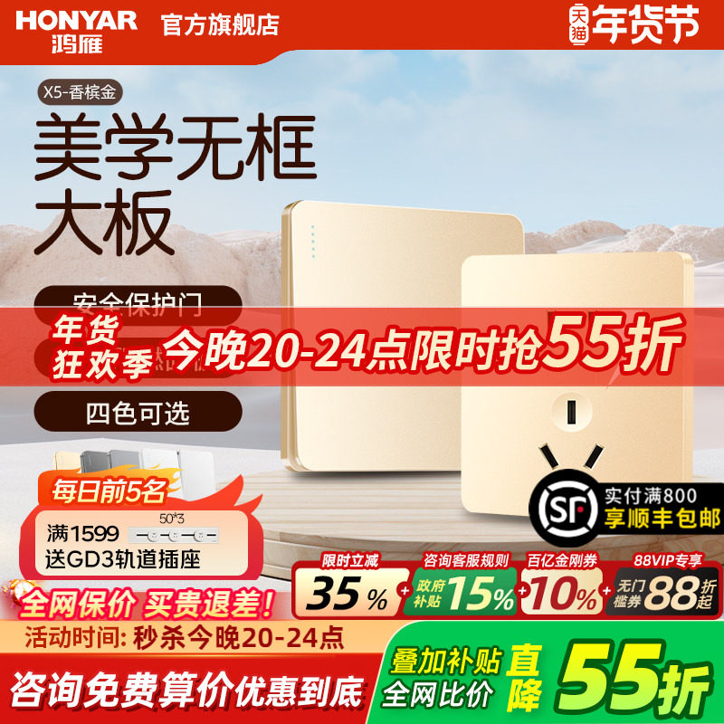 鸿雁开关插座面板86型五孔插座带开关家用暗装16a墙式usb插座X5金