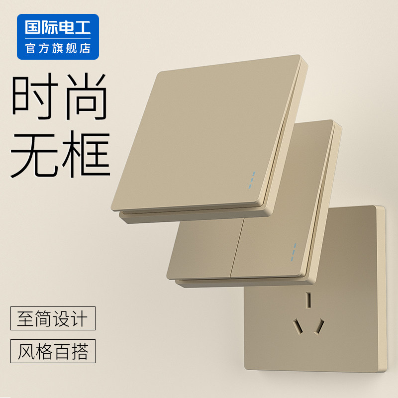 国际电工官方旗舰店家用86型墙壁香槟金色一开五孔插座带开关面板