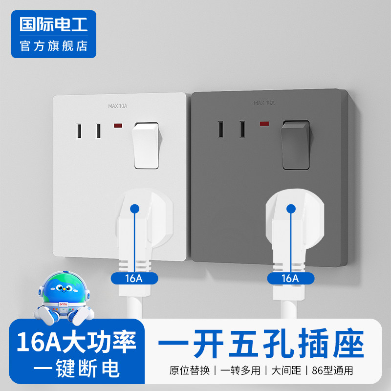 国际电工官方旗舰店家用86型暗装灰色墙壁一开五孔插座带开关面板