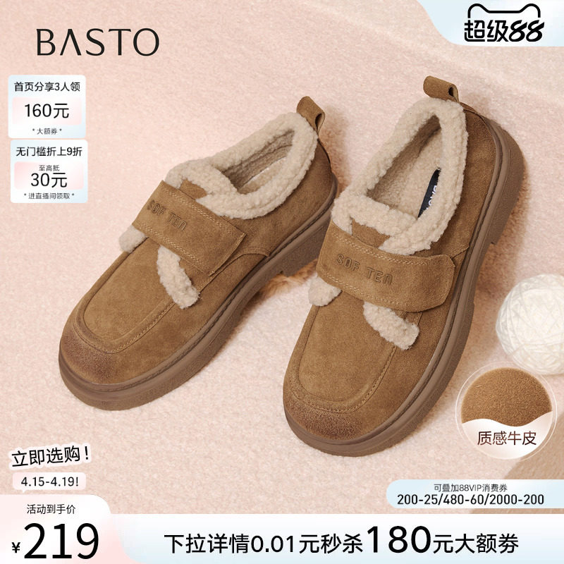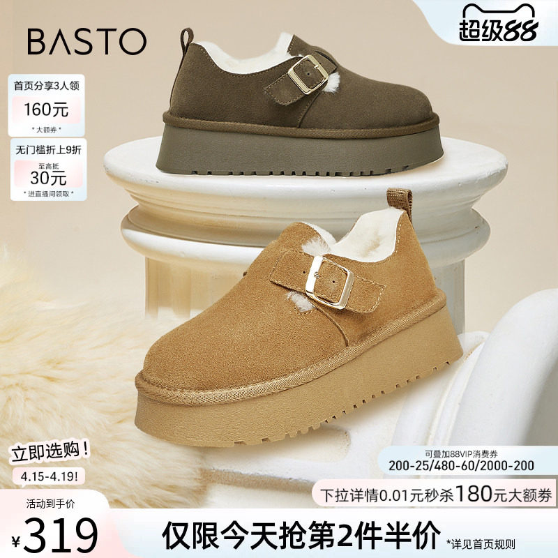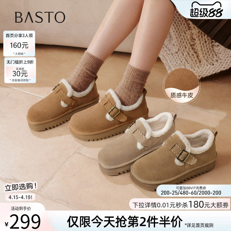 百思图冬季新款真皮毛毛鞋雪地靴棉鞋粗跟女休闲鞋BV511DM5