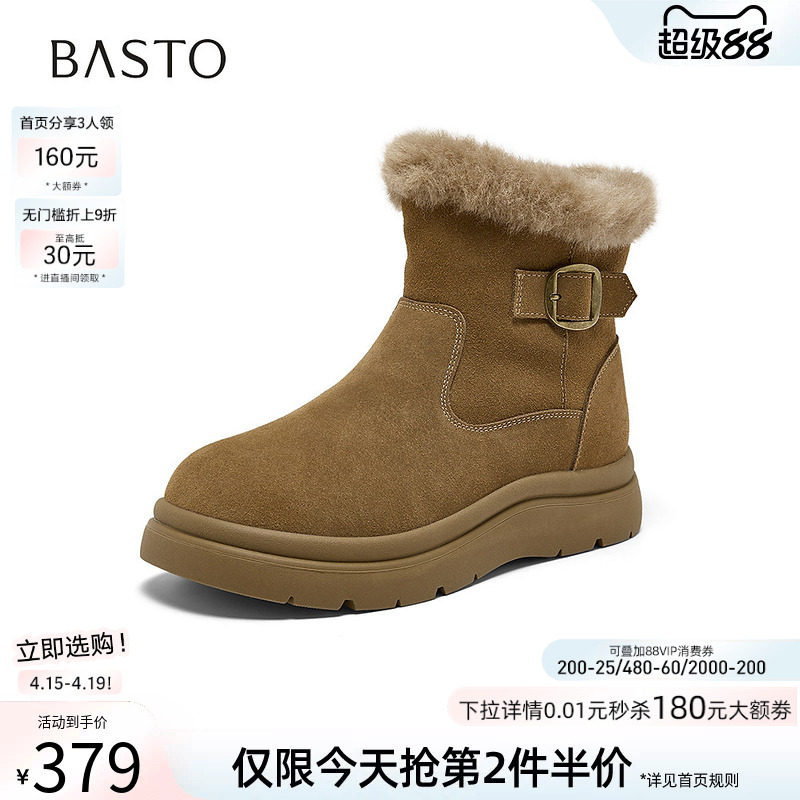 百思图冬季商场新款真皮雪地靴加绒保暖棉鞋女短靴D3970DD5