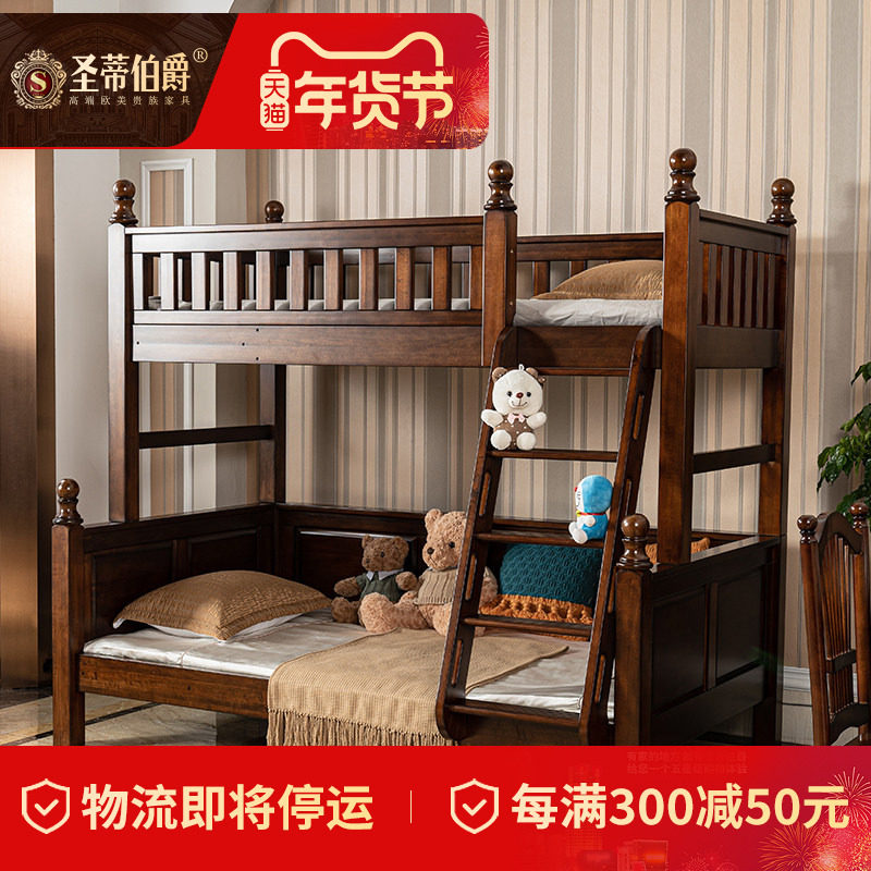 圣蒂伯爵美式全实木双层成人高低床母子复古床儿童上下铺多功能床