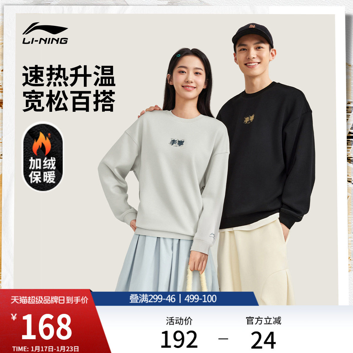 李宁加绒卫衣女冬季新款情侣圆领长袖加厚保暖宽松上衣男士运动服