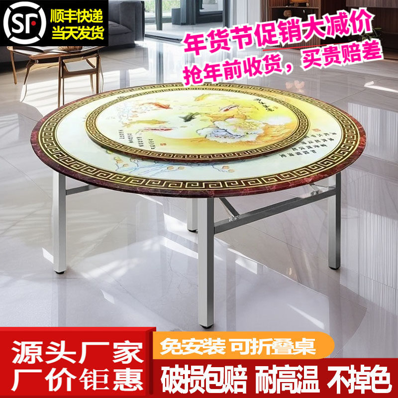 不锈钢圆桌折叠桌子家用餐桌彩色钢化玻璃面带转盘酒席喜庆户外桌