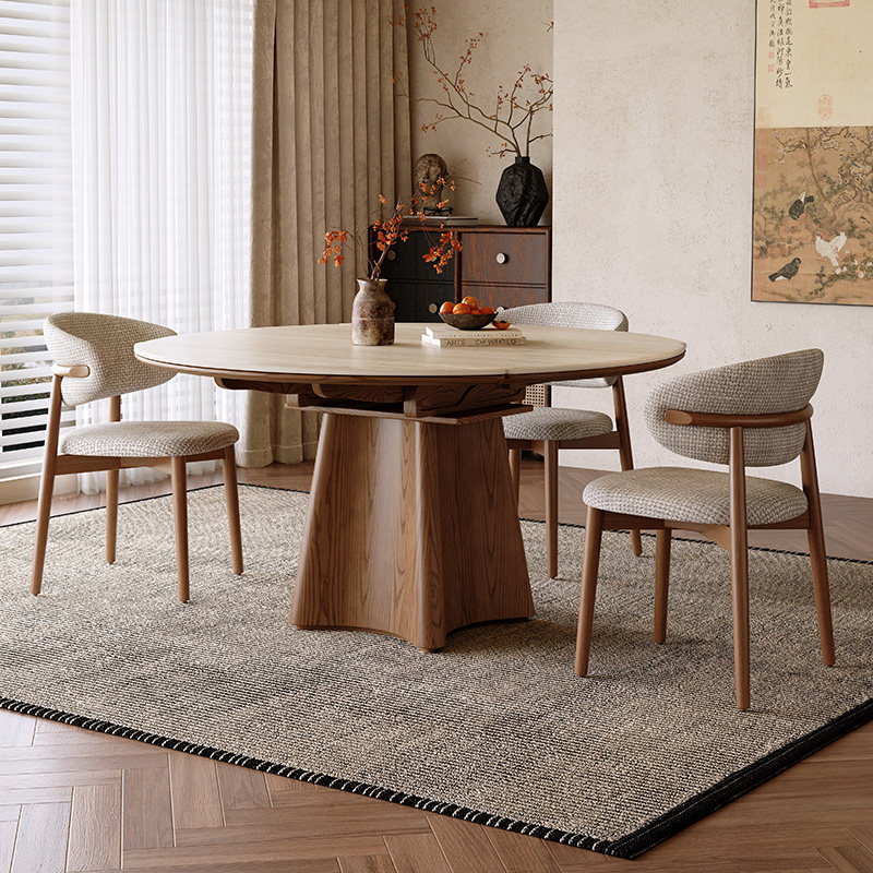 中古风洞石岩板伸缩餐桌可变圆桌折叠两用实木小户型复古家用饭桌