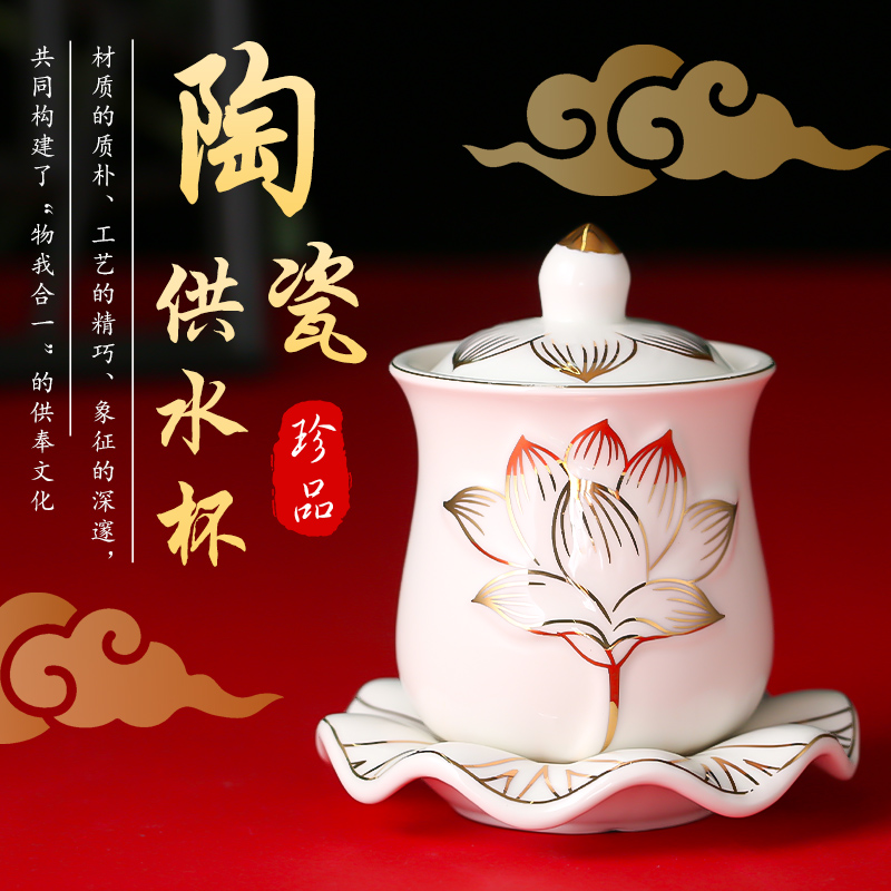 特大号供佛水杯财神水杯真金陶瓷无字莲花净水杯家用供水杯大悲水
