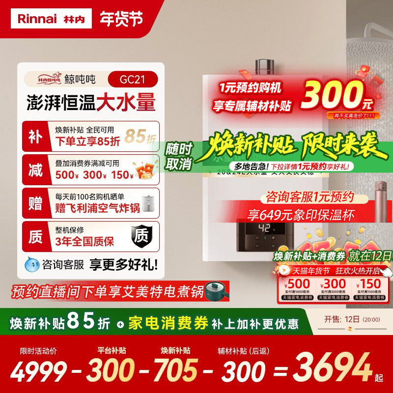 [鲸吨吨恒温]林内燃气热水器天然气恒温小蛮腰大水量20/24升GC21