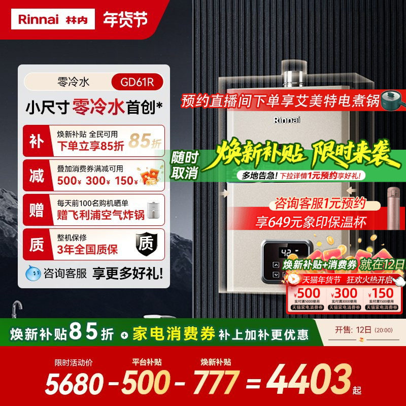[小蛮腰零冷水版]林内燃气热水器家用恒温天然气16/20/24升GD61R