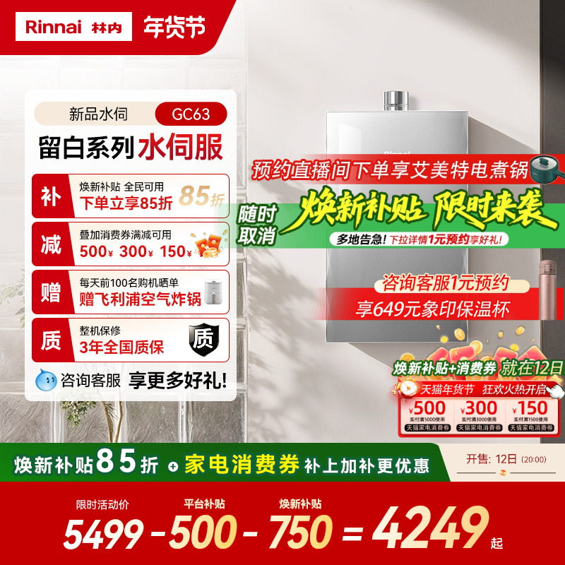 [新品水伺服]林内留白燃气热水器GC63家用天然气16/20升恒温速热