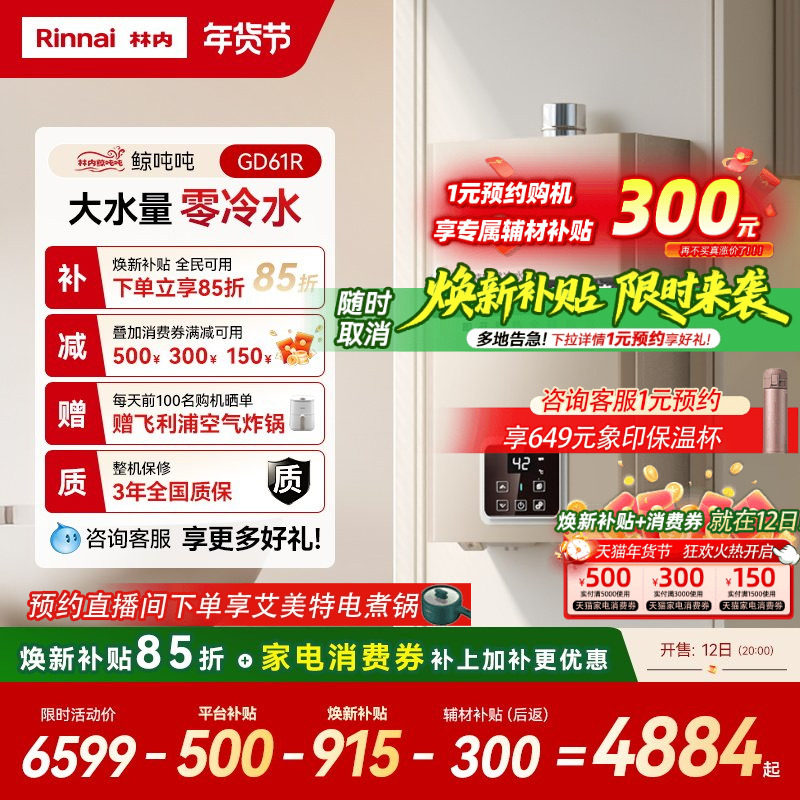[鲸吨吨零冷水]林内燃气热水器天然气恒温即开即热20/24升GD61R