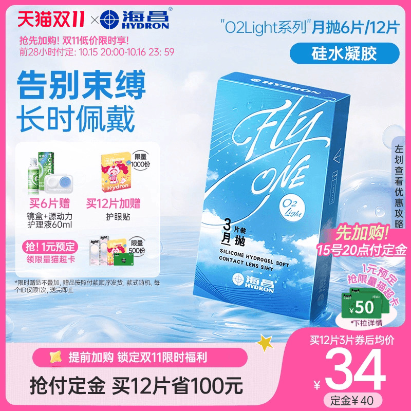 海昌O2light隐形近视眼镜月抛3片硅水凝胶高透氧水润透明官网正品