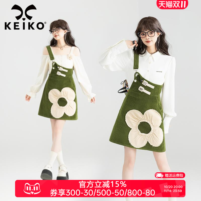 KEIKO复古抽皱贴布扎花单肩背带裙25秋季苔藓绿显瘦A字包臀连衣裙