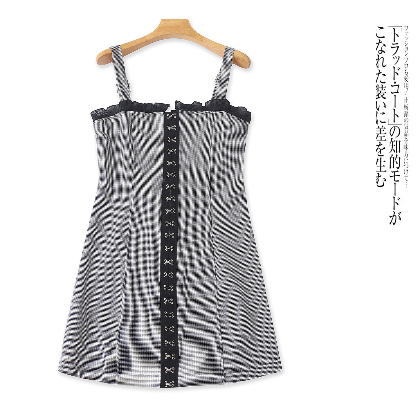 千鸟格背带连衣裙 夏季新款外贸女装花边抹胸领单排搭扣包臀短裙