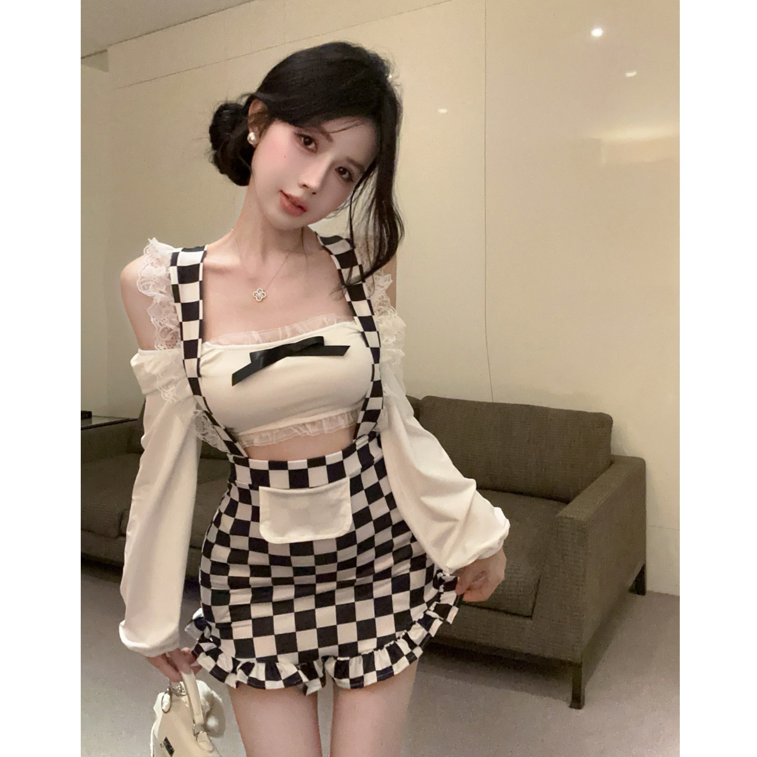 B-babes【奥利奥】纯欲性感紧身长袖T袖包臀鱼尾背带连衣裙套装女
