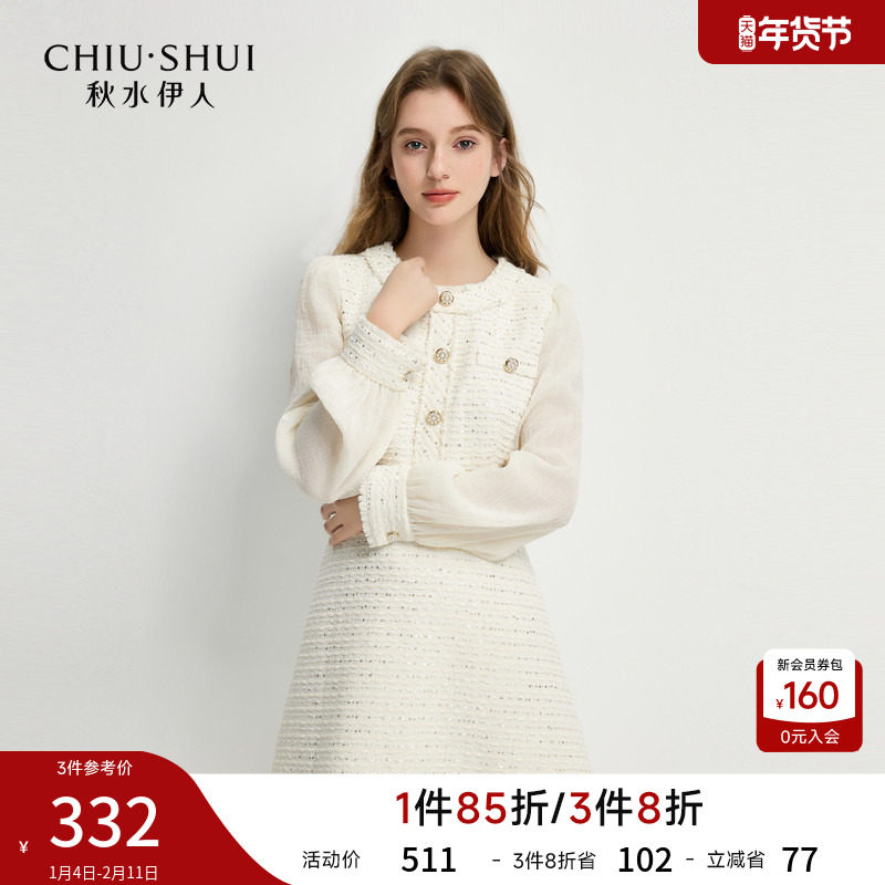 太平鸟白色醋酸混纺小香风通勤连衣裙女25新款仪式感约会连身裙*