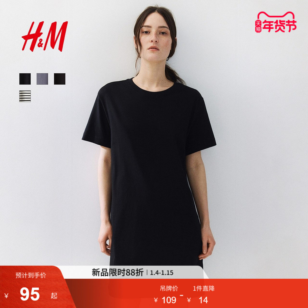 HM女装连衣裙春季纯棉圆领短袖简约休闲舒适T恤式连身裙1278156