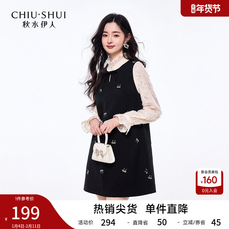 秋水伊人圆领法式连衣裙2025秋冬新款女简约通勤风绣花无袖连身裙