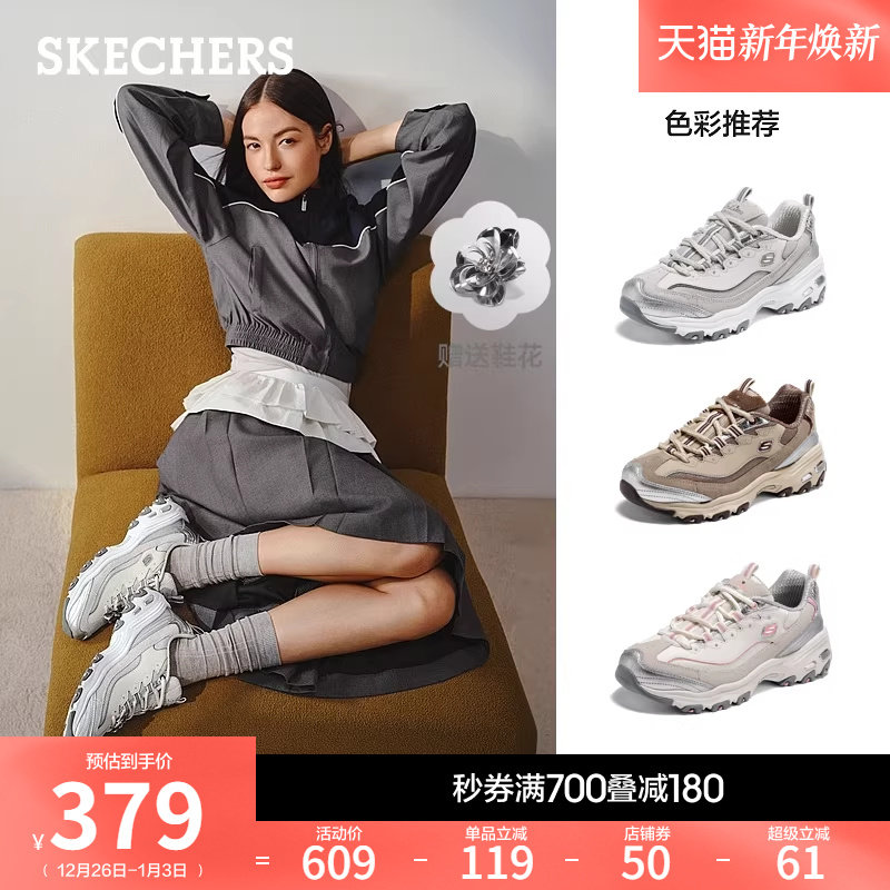 斯凯奇熊猫鞋秋冬季新款女鞋厚底增高休闲鞋银色老爹鞋时尚运动鞋