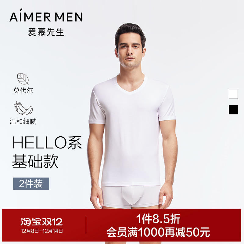 【2件装】爱慕先生HELLO系列秋冬莫代尔男士纯色打底V领短袖T恤