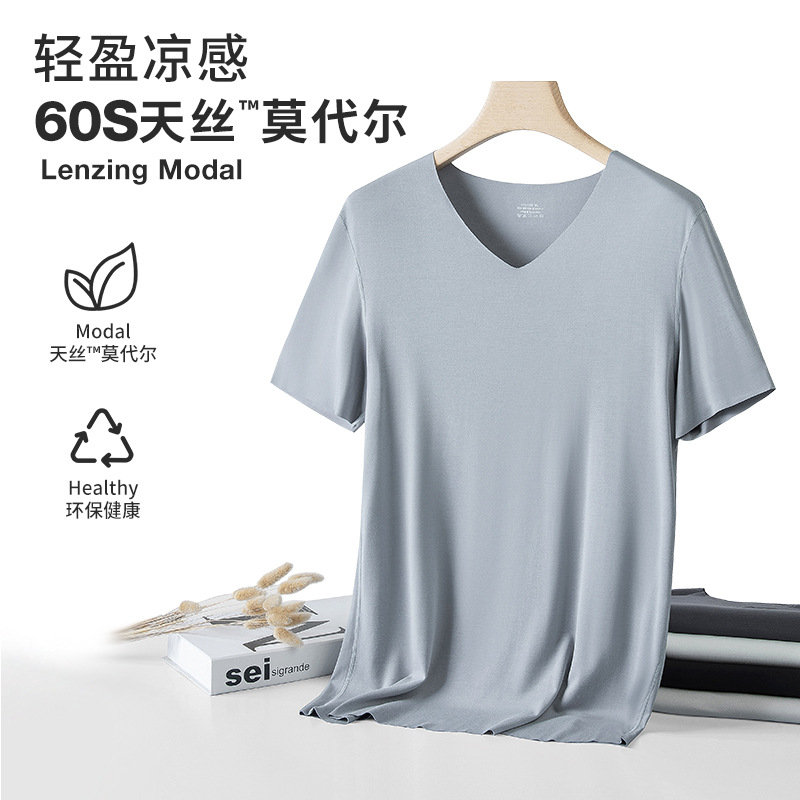 2件】莫代尔男士短袖t恤V领夏季纯色修身上衣服抗菌防螨冰丝半袖
