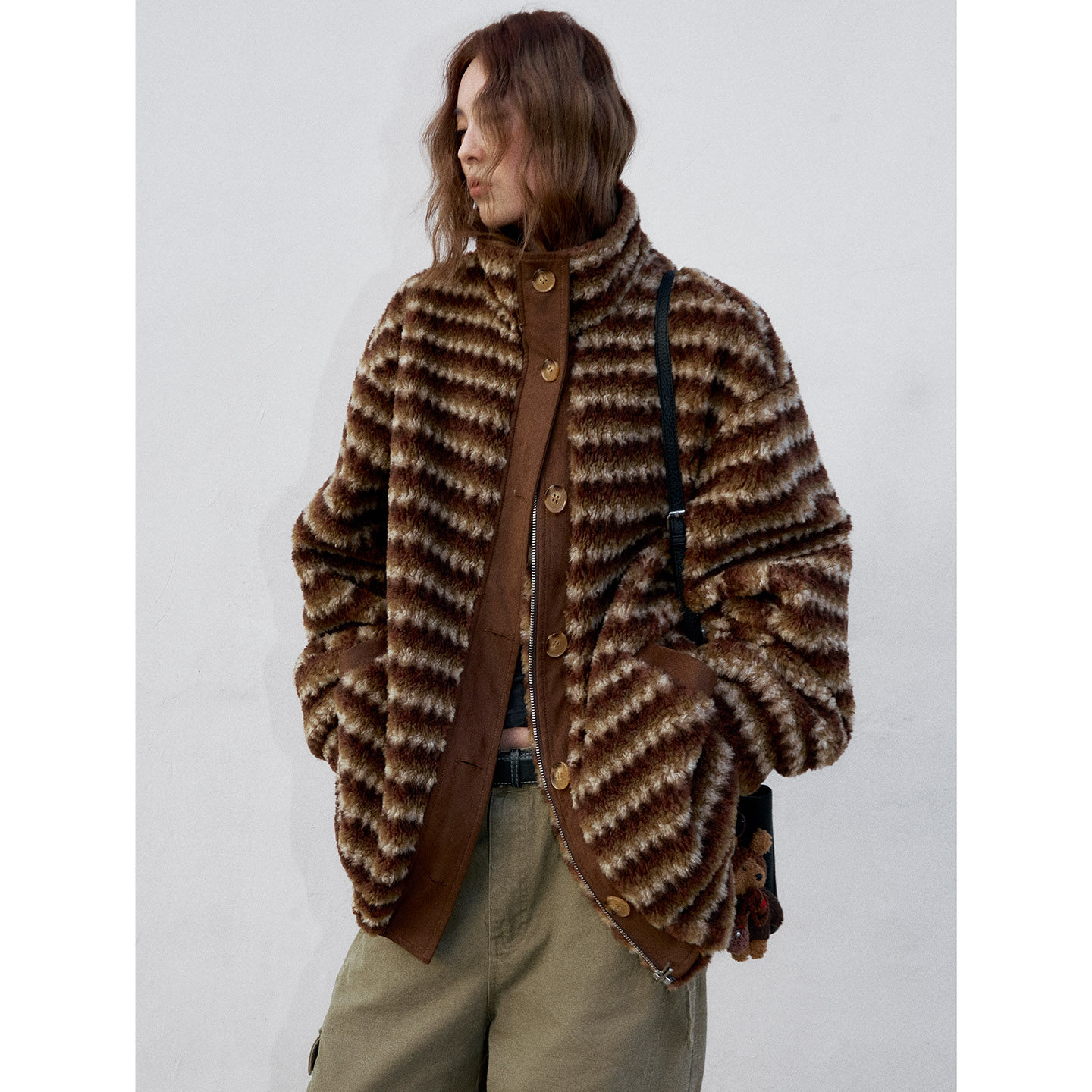 洛边 松茶可可 复古条纹毛毛短外套女立领美拉德棕色外套女绒毛