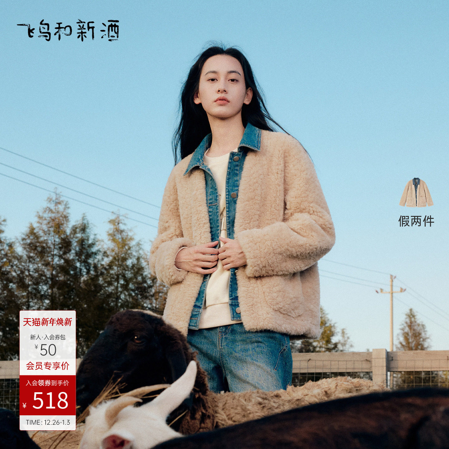 【假两件】飞鸟和新酒2025冬季新款驼色宽松拼接牛仔毛毛短外套女