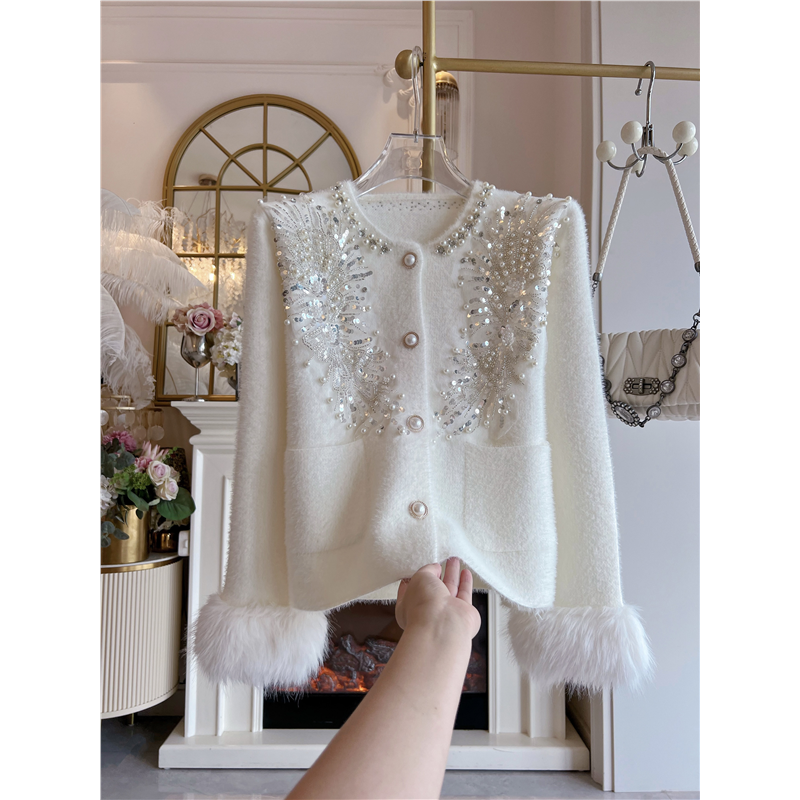 秋冬新款法式小香风宽松毛毛短外套重工镶钻长袖轻奢风毛衣开衫女